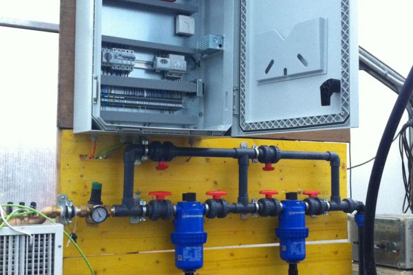 - Im Gewächshaus wurde ein Steuerschrank/Steuerung installiert, um die nötigen Ventile, Antriebe, Heizung, Belüftung und andere Geräte und Aktoren anzusteuern.